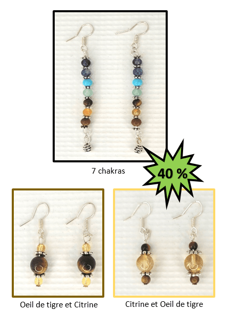 - 7 chakras : Bd1001-0 / 20 $ - 40 % = 12 $ - Oeil de tigre et citrine : B1003-31 / 15 $ - 40% = 9 $ - Citrine et Oeil de tigre : B1003-32 / 15 $ - 40% = 9 $